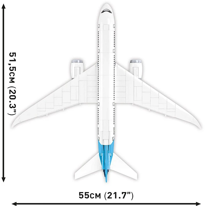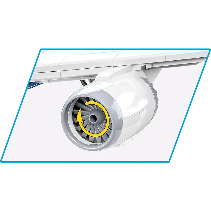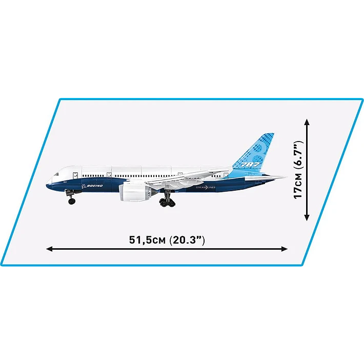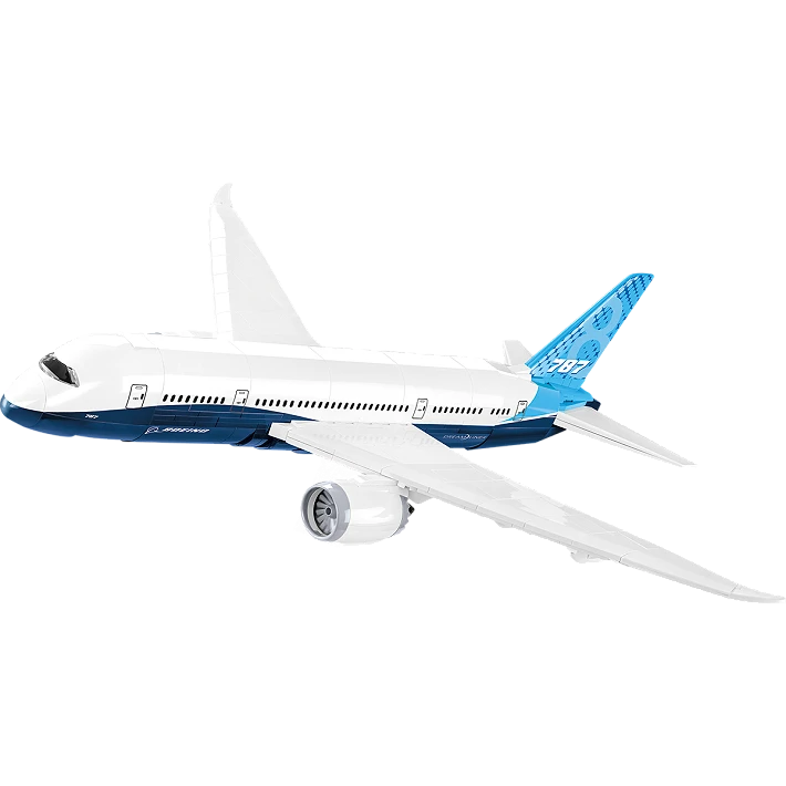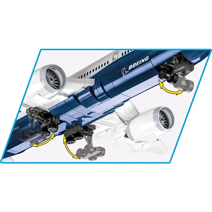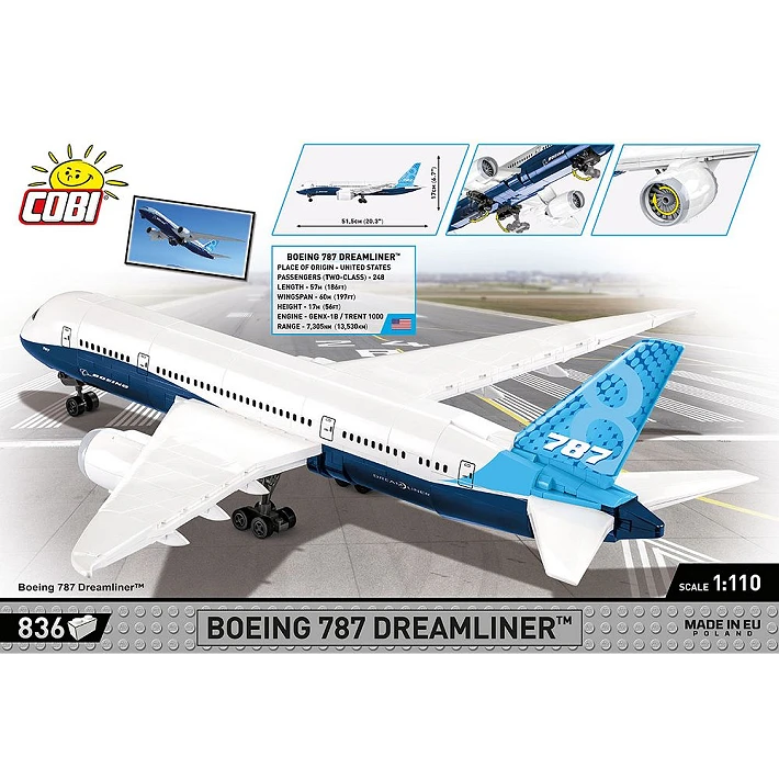 Model najnowszego samolotu pasażerskiego Boeing 787-8™ Dreamliner™ został wiernie odwzorowany z 836 klocków konstrukcyjnych COBI. Specjalnie zaprojektowane w skali 1:110 elementy wiernie oddają kształt pierwowzoru. Samolot został wyposażony w obracające się, koła i składane podwozie. Pod charakterystycznymi skrzydłami zamocowane są silniki z obrotowymi wirnikami.