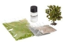 Opakowanie zawiera: 3 figurki, trawę, brązowy żwirek, szary żwirek, drzewo, klej.