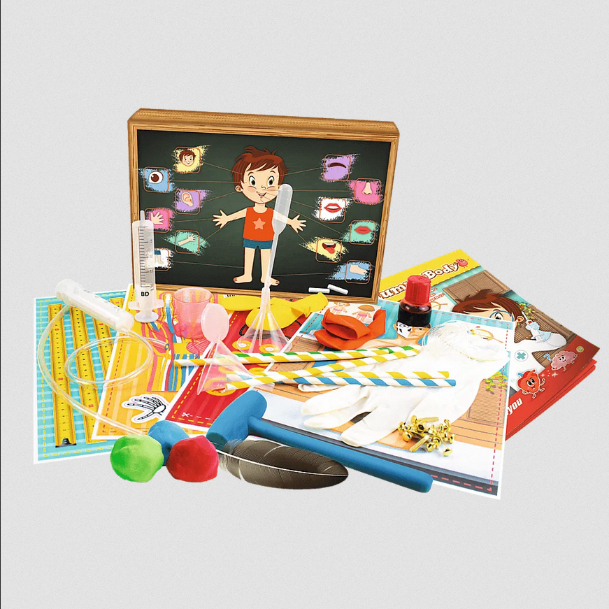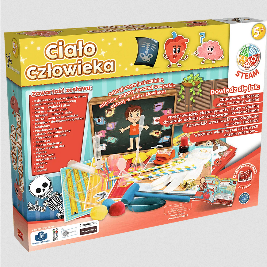 Poznaj tajniki ludzkiego ciała. Wykonuj eksperymenty, dzięki którym poznasz 5 układów w ciele człowieka: kostny, mięśniowy, nerwowy, pokarmowy oraz oddechowy. Dowiedz się, za co odpowiedzialne są nasze mięśnie i kości, wykonaj prototyp płuc, a następnie zbadaj swoje unerwienie za pomocą młoteczka dołączonego do zestawu.