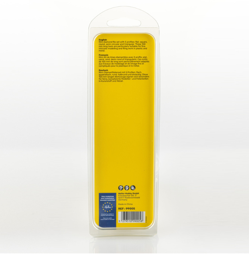 Zestaw 5 uniwersalnych, metalowych mini pilników modelarskich (tzw. iglaki) o przekrojach: płaskim, kwadratowym, okrągłym, półokrągłym i trójkątnym, z których każdy ma 100 mm długości całkowitej i średnicy ok. 5 mm. Cześć ścierna ma specjalną powłokę diamentową z diamentów syntetycznych. Oznacza to, że jest bardzo twarda i pozwala szybko usunąć zbędną warstwę. Cechują się przyzwoitą wytrzymałością mechaniczną. Rączka każdego z prezentowanych narzędzi została wykonana z tworzywa sztucznego w różnych kolorach. Pozwalają na skuteczną obróbkę przede wszystkim tworzyw sztucznych. Przy pewnej dozie umiejętności, można je zastosować przy obróbce wyschniętych mas szpachlowych i większości innych mas modelarskich, a nawet miękkiego drewna. Jednak w tym ostatnim przypadku praca może być utrudniona. Ze względu na swoje stosunkowo niewielkie rozmiary okażą się użyteczne zwłaszcza przy pracy z wszelkiego typu detalami modelarskimi, jak również przy obróbce figurek. Z powodzeniem można je wykorzystać przy pracy z modelami samolotów w skali 1:72 i 1:144 czy okrętów w skali 1:700. Pilnik o przekroju okrągłym pozwala na szlifowanie powierzchni zaokrąglonych i wklęsłych. Prezentowane narzędzia okażą się szczególnie użyteczne w modelarstwie plastikowym oraz przy konstruowaniu dioram.
