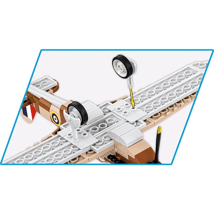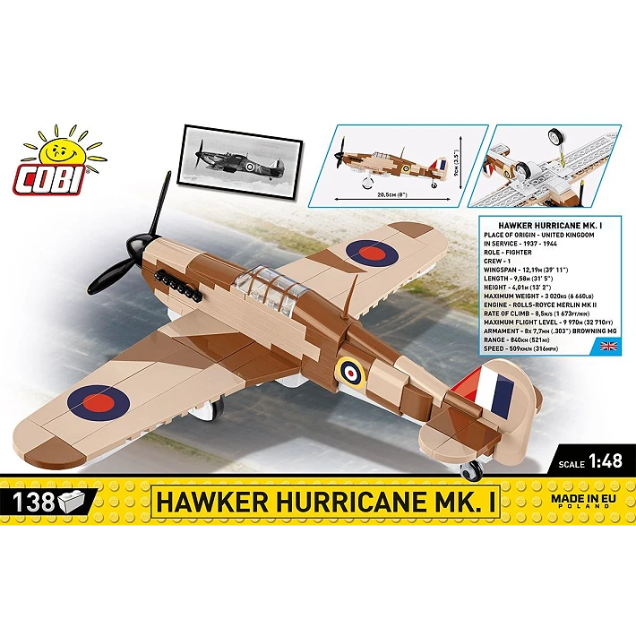 Jeden z najpopularniejszych brytyjskich myśliwców z okresu II wojny światowej. Bardzo dobrze sprawował się w akcji, stawiając czoła niemieckim Messerschmittom. Uzbrojenie strzeleckie stanowiło osiem karabinów maszynowych Browning kalibru 7,7 mm. Przygotowany przez COBI model ma barwy nawiązujące do działań w Afryce Północnej i w basenie Morza Śródziemnego w 1940 roku. Samolot zaprojektowany w skali 1:48 zbudujesz z 138 elementów, na których znajdują się nadruki z oznaczeniami. Samolot ma 20 cm długości i 25,5 cm rozpiętości skrzydeł. Świetnie nadaje się do ekspozycji w kolekcji fana lotnictwa oraz do zabawy. Dzięki kompaktowemu rozmiarowi bez problemu zmieści się na Twojej półce! Buduj historię, klocek po klocku!