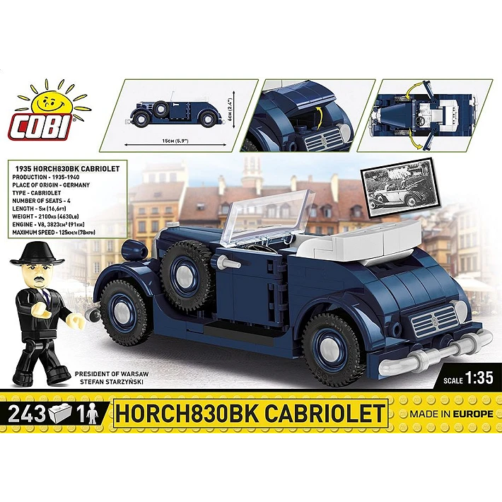 Kabriolet Horch830BK wykonany w rewelacyjnej modelarskiej skali 1:35 to kolejny zestaw nawiązujący do historii motoryzacji! Zastosowanie specjalnie zaprojektowanych na potrzeby pojazdów elementów sprawia, że modele COBI prezentują się bardzo atrakcyjnie, zachowując wiele zaskakujących detali. Na szczególną uwagę zasługują precyzyjne nadruki w miejsce niegdyś stosowanych naklejek. Model Horch830BK jest znacznie krótszy od limuzyny, którą poruszał się m.in. Generał De Gaulle.