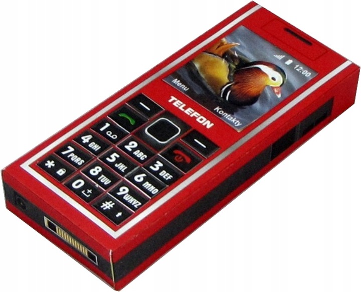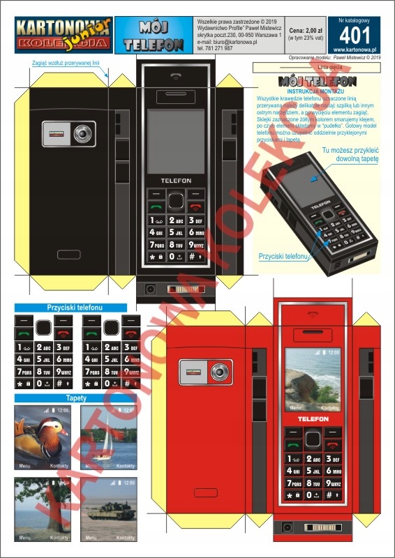 Wycinanka zawiera dwa modele telefonu w kolorze czarnym i czerwonym wraz z wymiennymi tapetami i dodatkowymi przyciskami.