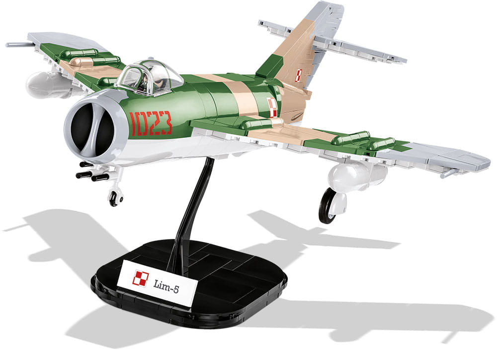 Model samolotu LIM-5 (MIG-17F ) został zaprojektowany w modelarskiej skali 1:32 i składa się z 575 wysokiej jakości elementów. Wszystkie oznaczenia i napisy znajdujące się na modelu to nadruki, które nie ścierają się w trakcie użytkowania. Zestaw posiada ruchome elementy takie jak koła oraz otwierana kabina, w której możemy umieścić rewelacyjną figurkę polskiego pilota, wyposażonego w furażerkę z nadrukowanym stopniem i emblematem lotnictwa polskiego. Szczególnie pięknie prezentuje się odwzorowany z klocków kamuflaż. Do zestawu dołączona jest podstawka ekspozycyjna zawierająca tabliczkę z nazwą zestawu i oznaczeniem przynależności państwowej. Dzięki intuicyjnej instrukcji opartej na czytelnych ikonach budowa jest prosta. Samolot to pozycja obowiązkowa dla wszystkich fanów lotnictwa, militariów i techniki wojskowej. Stanowi również doskonałe uzupełnienie kolekcji Armed Forces, Cold War i Korean War. W tej serii wydaliśmy również samoloty LIM-1, MIG-15 w wersji radzieckiej oraz czechosłowacki S-102.
