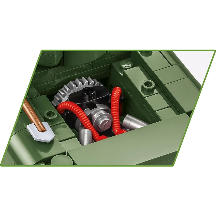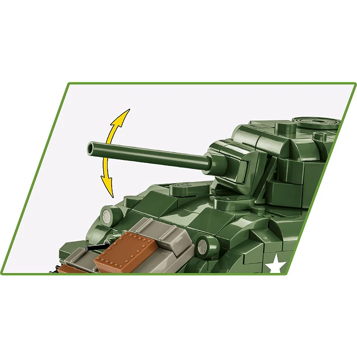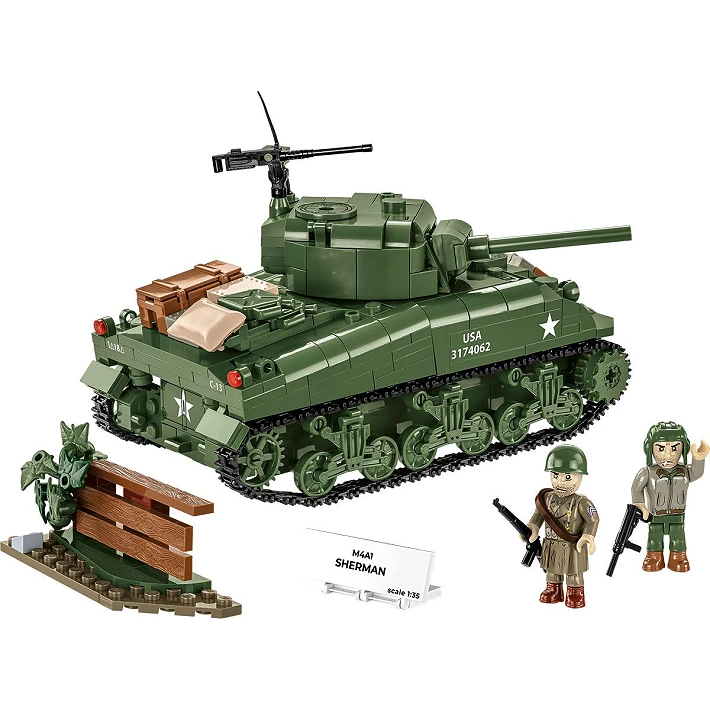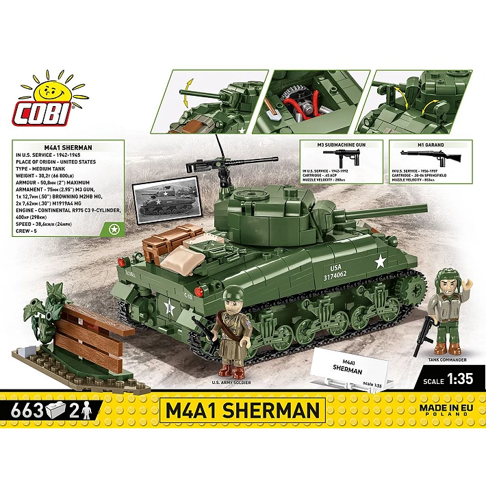 Klockowy Sherman został starannie zaprojektowany w skali 1:35 przy wykorzystaniu 663 elementów. Czołg zawiera działającą trakcję gąsienicową, obracającą się wieżę, ruchomą lufę, otwierany właz oraz klapę serwisową, pod którą znajduje się klockowa atrapa silnika. Do zestawu dołączona jest figurka amerykańskiego czołgisty z hełmofonem i pistoletem maszynowym M3 “Smarownica”. Druga figurka przedstawia żołnierza piechoty ubranego w gruby płaszcz i uzbrojonego w karabin M1 Garand. Na klockach znajdują się wysokiej jakości nadruki, które odzwierciedlają oznaczenia i detale czołgu, szczegóły umundurowania dowódcy czołgu oraz żołnierza piechoty. Do zestawu dołączone zostały elementy otoczenia: fragment płotu wraz z żywopłotem. Zestaw został opracowany z dbałością o detale i jest również doskonałym rozwinięciem popularnej serii Historical Collection! Fani historii oraz klocków znajdą tutaj coś dla siebie!