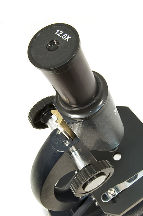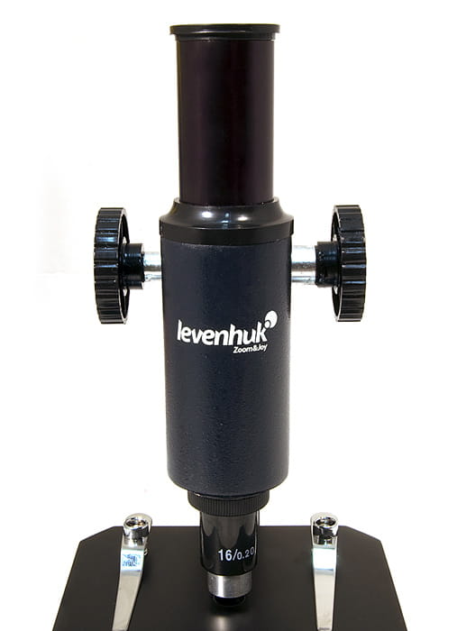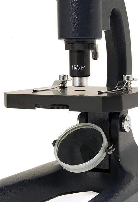 Ten monokularowy mikroskop posiada pojedynczą, achromatyczną soczewkę obiektywową 16x, co zapewnia czysty obraz bez żadnej aberracji chromatycznej lub sferycznej. W tym modelu głowica jest umieszczona bezpośrednio nad stolikiem, jednak wykorzystując ramię teleskopu, można nachylić zarówno głowicę, jak i stolik pod wybranym kątem, tak aby komfortowo prowadzić obserwacje.