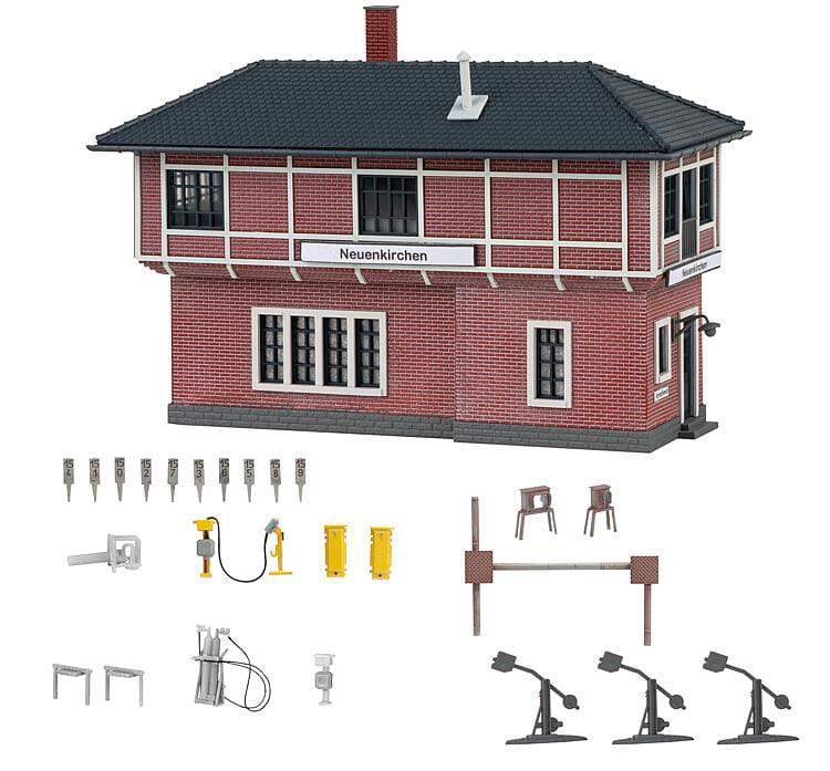 Opakowanie zawiera murowaną nastawnie dwukondygnacyjną z elementami dekoracji zewnętrznej m. in. trzy dźwignie przełączające i słuki hektometryczne.