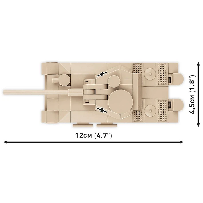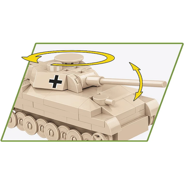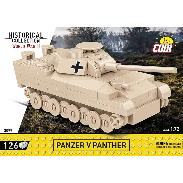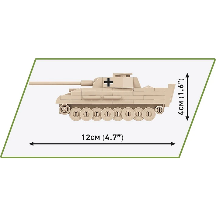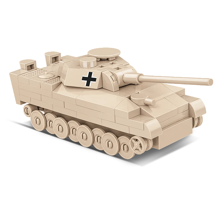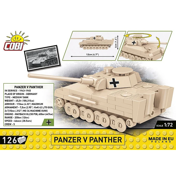 Mini model z klocków konstrukcyjnych COBI został zaprojektowany w skali 1:72 i składa się ze 126 wysokiej jakości elementów. Po zbudowaniu czołg ma 12 cm długości. Pomimo kompaktowego rozmiaru model zachował wszystkie najważniejsze cechy swojego historycznego pierwowzoru! Na bokach pojazdu znajdują się nadrukowane oznaczenia niemieckie. Wieża czołgu jest ruchoma i można nią obracać. Lufa porusza się w kierunku góra-dół. Model nadaje się w sam raz na dobry początek przygody z klockami konstrukcyjnymi COBI. Pantera to również ciekawy model i gadżet dla kolekcjonerów. Zajmuje niewiele miejsca i z łatwością znajdzie swoje miejsce na biurku w domu, w pracy czy też na regale z książkami.
