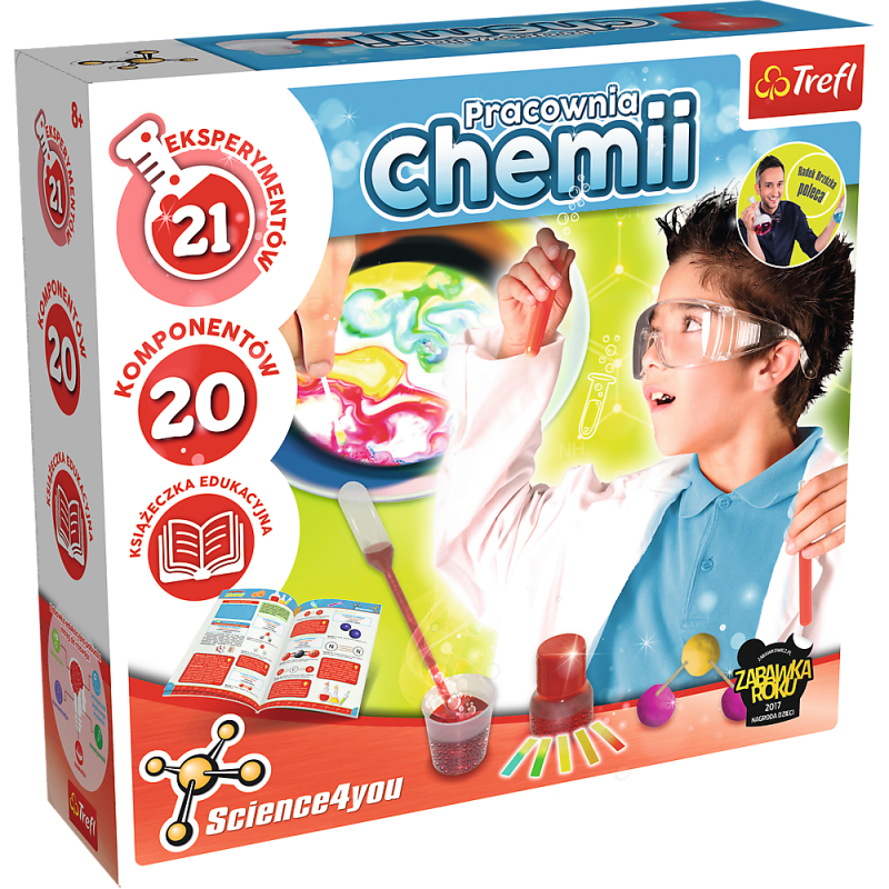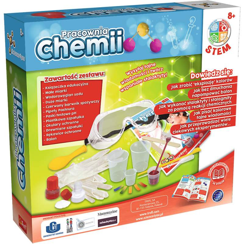 Dzięki Pracownia Chemii od Science4you dowiesz się, jak stworzyć fantastyczne, tajne, kolorowe wiadomości za pomocą jedzenia. Usmaż jajko bez użycia ciepła oraz nadaj mu kształt kwadratu podczas gotowania. Przygotuj także rakietę i zabawne krystaliczne kształty. Użyj odczynników, które znajdziesz w kuchni, aby przeprowadzić ciekawe eksperymenty naukowe.