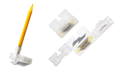 Obsadka noża ma kwadratowy przekrój, zabezpieczający przed stoczeniem się noża ze stołu. Kształt ten pozwala również na pewne połączenie jej z nowym pojemnikiem na ostrza - i to na dwa sposoby. Pierwszy z nich to wsunięcie obsadki do prowadnicy wzdłuż boku pojemnika, wygodne do wspólnego przechowywania noża z ostrzami zapasowymi.
