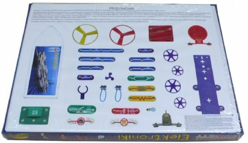 Kompletny zestaw elementów, który pozwoli wejść w tajemniczy świat elektroniki i elektrotechniki. Zestaw może służyć, jako wspaniałe narzędzie, dzięki któremu poznajesz tajniki tych ciekawych dziedzin wiedzy. Może być używany zarówno w szkole jak i w domu. Zajmujące i stymulujące wyobraźnię eksperymenty zapewnią wiele godzin wspaniałej zabawy a jednocześnie pozwolą na poznanie zasad działania układów elektronicznych. 50 ekscytujących eksperymentów oraz możliwość zbudowania modelu samochodu i łódki.