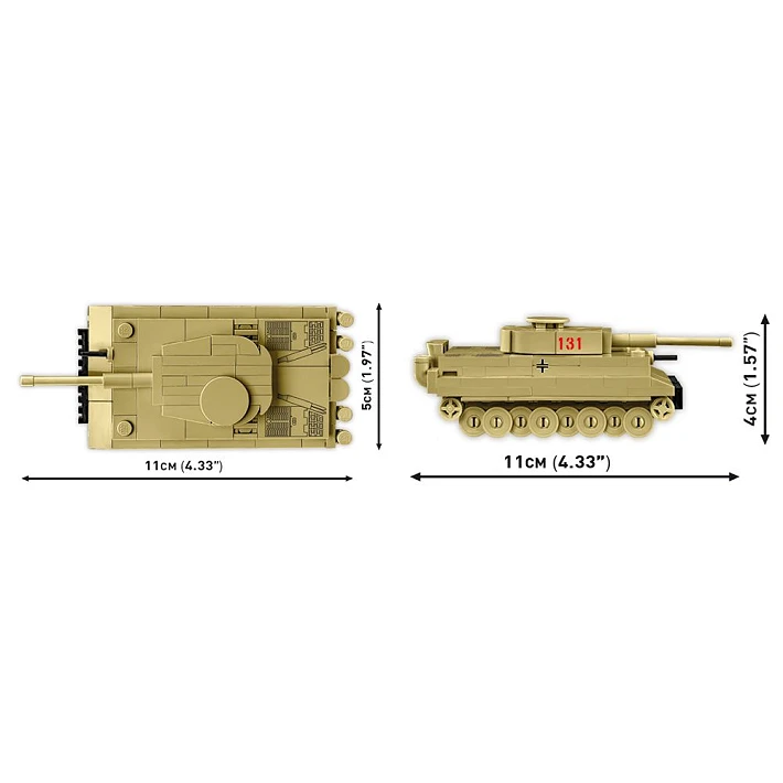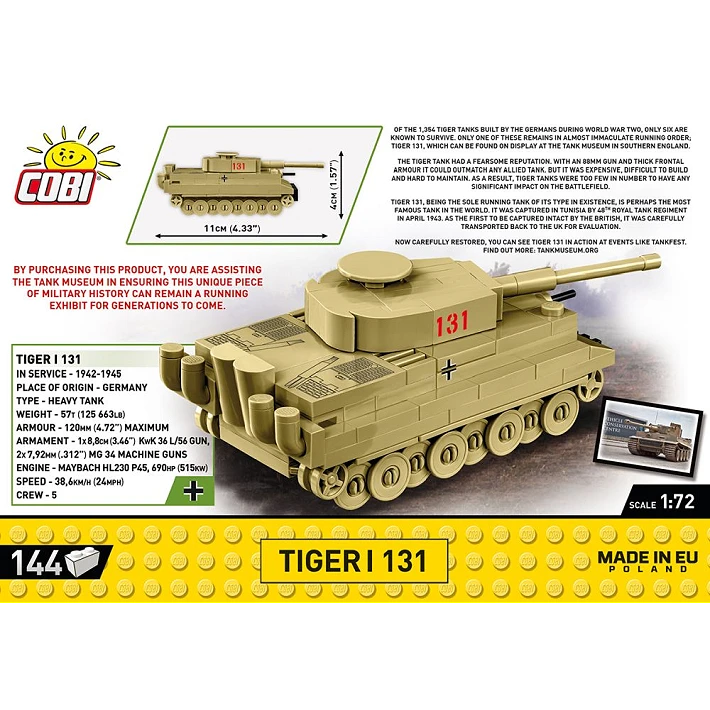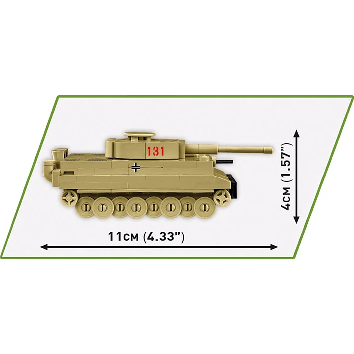 Mini model z klocków konstrukcyjnych COBI został zaprojektowany w skali 1:72 i składa się ze 144 wysokiej jakości elementów. Po zbudowaniu czołg ma 11 cm długości. Pomimo kompaktowego rozmiaru model zachował wszystkie najważniejsze cechy swojego historycznego pierwowzoru! Na bokach pojazdu znajdują się nadrukowane oznaczenia niemieckie. Również takie detale jak klapy serwisowe i wentylacja silnika to nadruki! Czołgiem można poruszać dzięki zamontowanym kółkom. Również wieża czołgu jest ruchoma i można nią obracać.