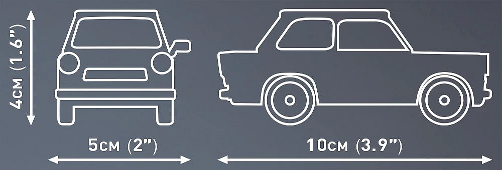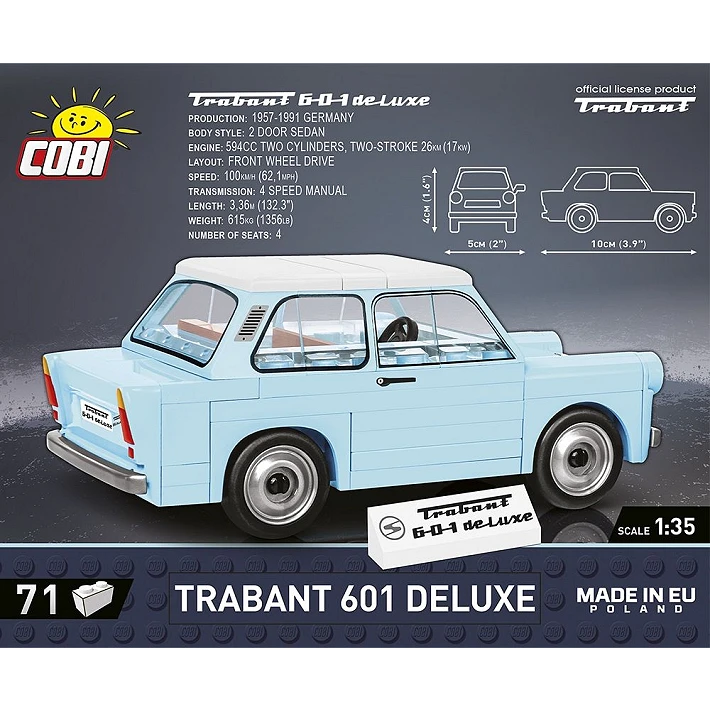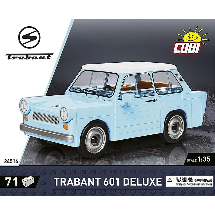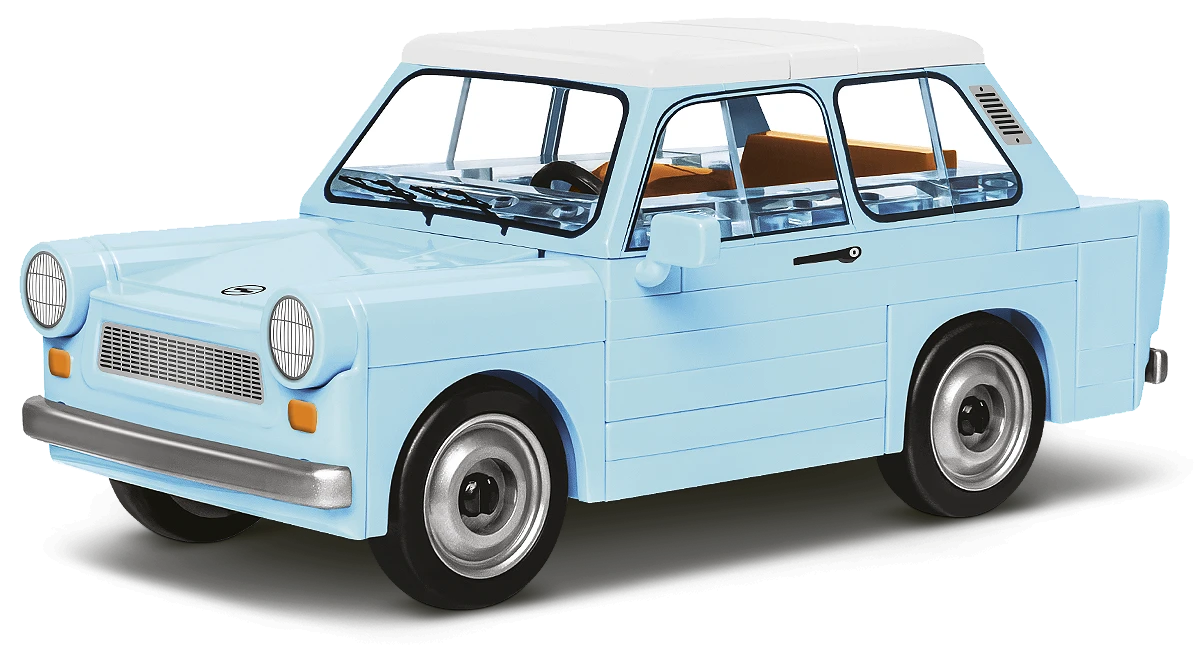 Model w skali 1:35 składa się z 72 klocków konstrukcyjnych COBI i bardzo wiernie oddaje charakterystyczne kształty oryginalnego Trabanta 601. Auto zostało opracowane w nowym jasnoniebieskim kolorze klocków, jeszcze bardziej zbliżonym do kultowego oryginału! Samochód posiada obracające się koła wyposażone w opony, które idealnie nadają się do poruszania modelem w trakcie zabawy. W naszych zestawach zrezygnowaliśmy z naklejek! Zostały one zastąpione trwałymi nadrukami, które nie ścierają się nawet w trakcie intensywnej zabawy.