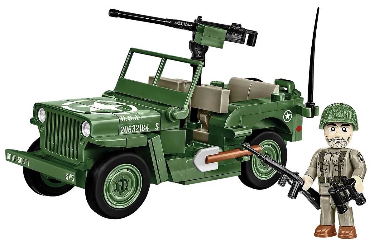 Najpopularniejszy na świecie samochód terenowy został zaprojektowany w skali 1:35 i składa się ze 132 elementów. Klockowe auto jest wyposażone w ciężki karabin maszynowy oraz akcesoria. Koła z gumowymi oponami obracają się i można poruszać samochodem podczas zabawy. Do zestawu dołączona jest figurka przedstawiająca żołnierza amerykańskiej 101 Dywizji Powietrznodesantowej (Screaming Eagles). Na pojeździe i figurce znajdują się wysokiej jakości nadruki, które są wzorowane na historycznych oznaczeniach zaczerpniętych bezpośrednio z zabytkowego samochodu należącego do firmy COBI! Nie pominęliśmy nawet takich detali jak naszywki z charakterystycznym orłem na ramieniu żołnierza! Zestaw doskonale uzupełnia bardzo bogatą serię Historical Collection WWII od COBI!