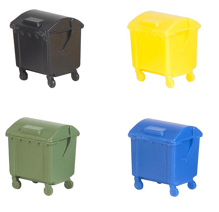 Wielokolorowy zestaw składający się z ośmiu dużych nadających się do recyklingu plastikowych pojemników z czterema kołami i okrągłym przesuwanym wiekiem.