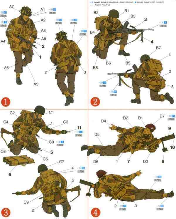 Zestaw zawiera 4 figurki brytyjskich spadochroniarzy i 4 szt. broni.